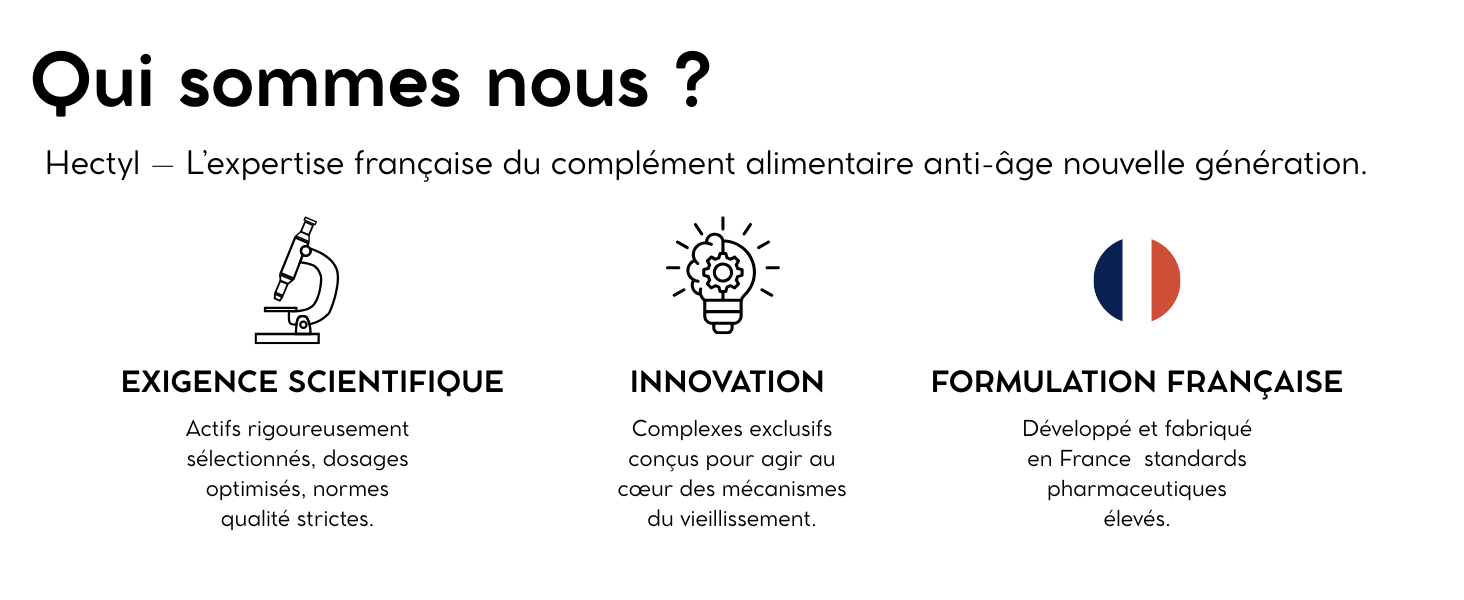 Études disponibles sur demande – Produit fabriqué selon les normes GMP et HACCP – Formulation issue de la recherche scientifique anti-âge Hectyl